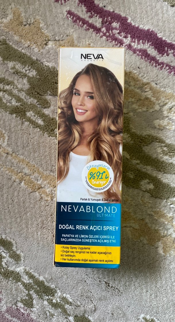 Neva Nevablond doğal renk açıcı sprey, papatya ve limon özleri içerir. Saçlarda güneşten açılmış doğal bir görünüm sağlar, kolay uygulanır. 2 kutu var biri hiç açılmadı diğeri yarımdan biraz fazla