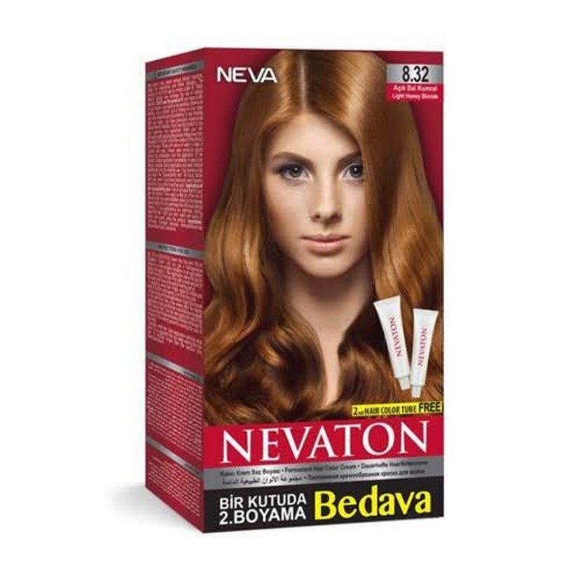 Neva Nevaton 8.32 Açık Bal Kumral saç boyası, bir kutuda iki boya tüpü içerir ve ikinci boya ücretsizdir. Zengin renk ve kapama sağlar. tüm renkleri mevcuttur