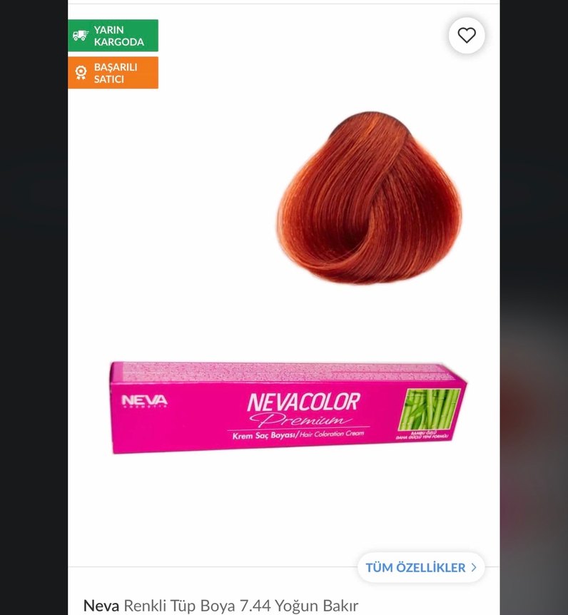 Neva tüp saç boyası 7.44 yoğun bakır renginde, canlı ve zengin renk sonuçları sağlar. Ürün hiç açılmadı alırken kargo ücretsiz olsun diye çok sipariş verdim fakat saç rengimi değiştirmeye karar verdiğim için satıyorum