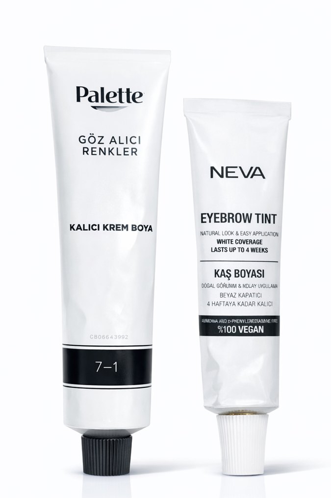 Neva kaş boyası ve Palette kalıcı krem boya içeren set, kaş ve saç renklendirme için uygundur. Her ikisi de vegan ve dayanıklı renklendirme sağlar. palette 7-1 az kullanıldı neva açık kahve kaş boyası yarısı dolu