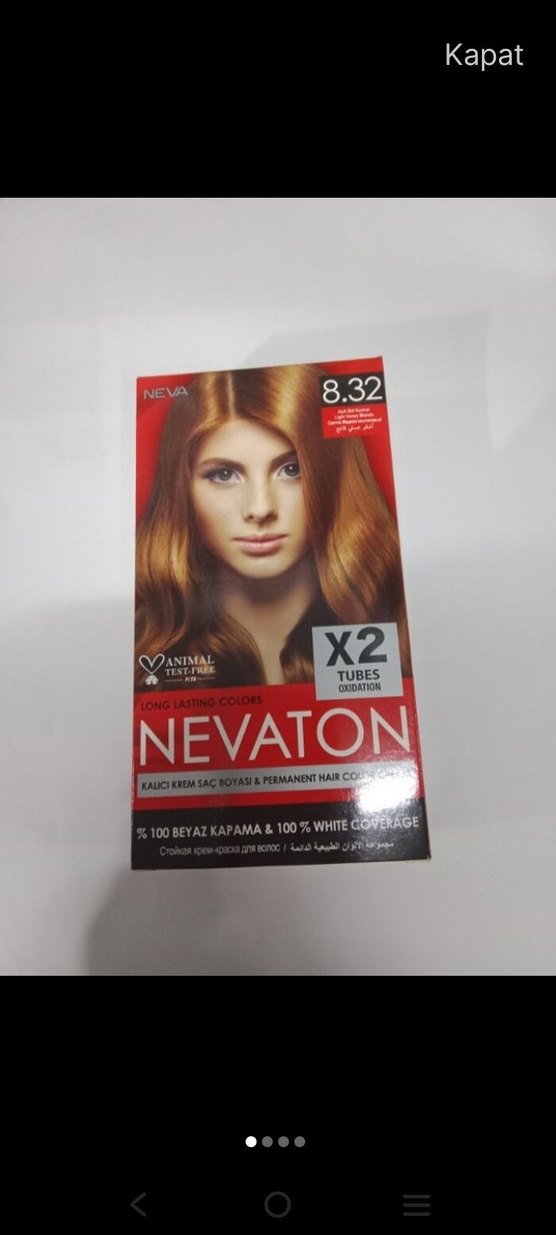 Nevaton 8.32 kalıcı saç boyası, uzun süre kalıcı renk ve %100 beyaz kapama sağlar. İki tüp oksidasyonlu set halinde sunulur.