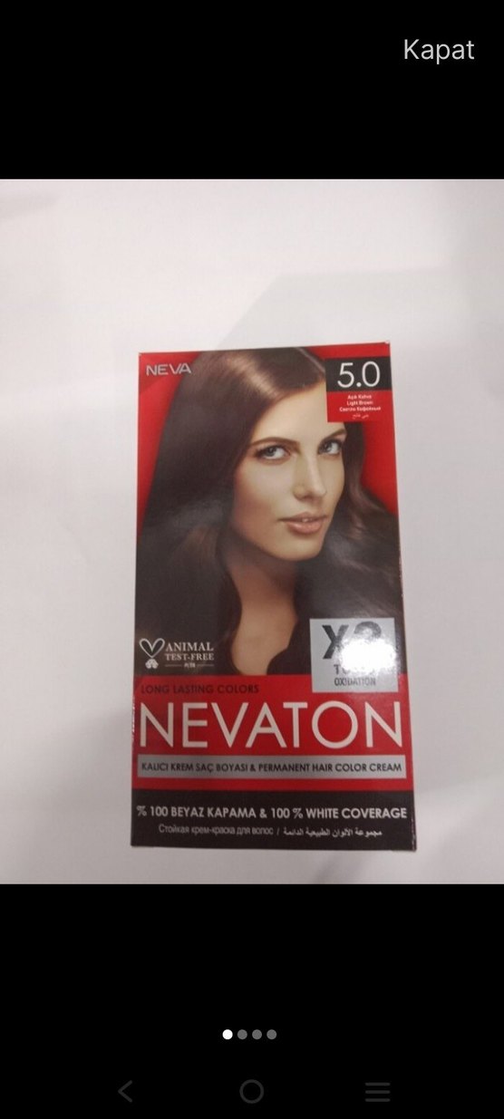 Nevaton 5.0 koyu kahve kalıcı krem saç boyası, %100 beyaz kapama sağlar ve uzun süre kalıcı renklendirme sunar. Hayvanlar üzerinde test edilmemiştir.