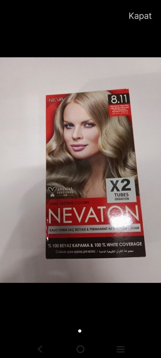 Nevaton 8.11 açık küllü sarı kalıcı saç boyası, %100 beyaz kapama sağlar ve iki tüp içerir. Hayvan testi yapılmamıştır, uzun süre kalıcı renk sunar.
