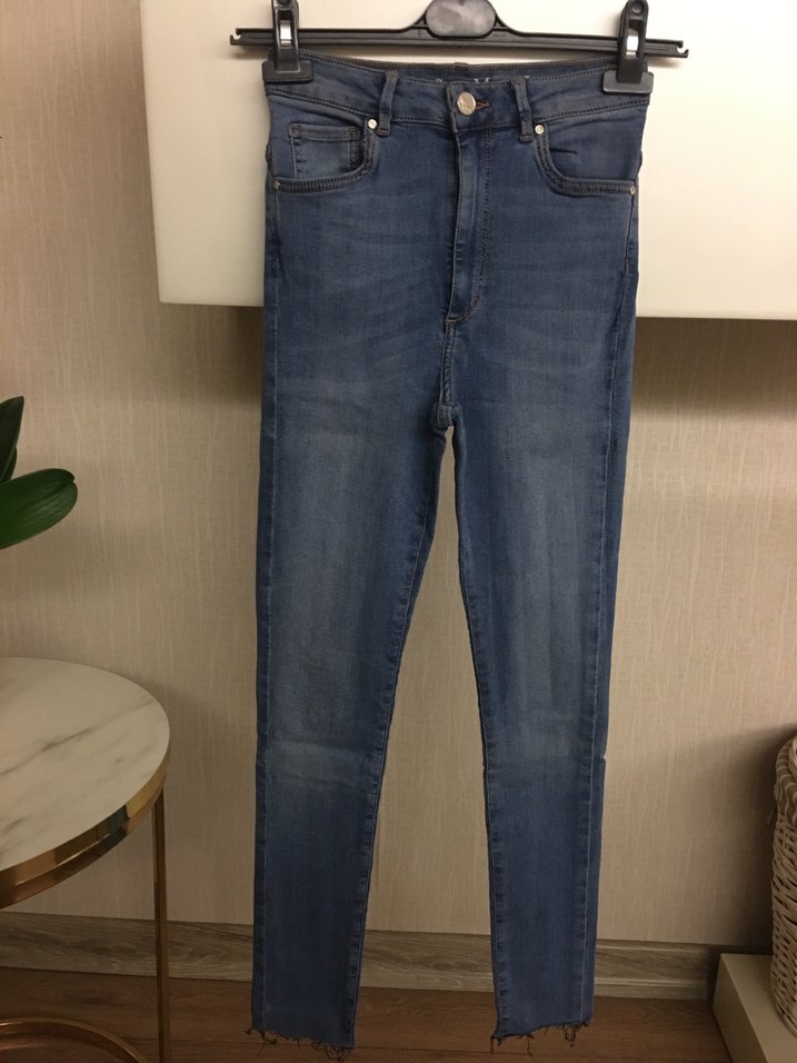 S bedendir. BEsnek likralı yüksek bel skınny pantolon. Beden ölçüleri: Boy 96, bel 32, kalça 36, düğmeden ağ 29 cm’dir