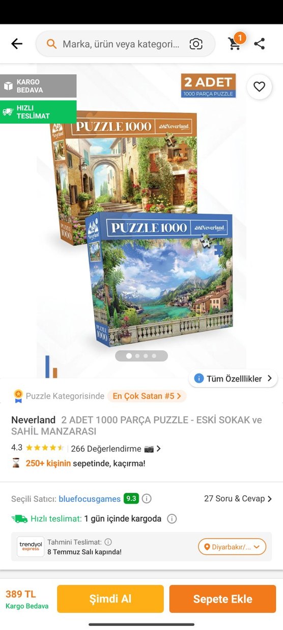 İki adet 1000 parçadan oluşan puzzle seti, eski sokak ve canlı sahil manzarası detayları ile keyifli bir yapboz deneyimi sunar.