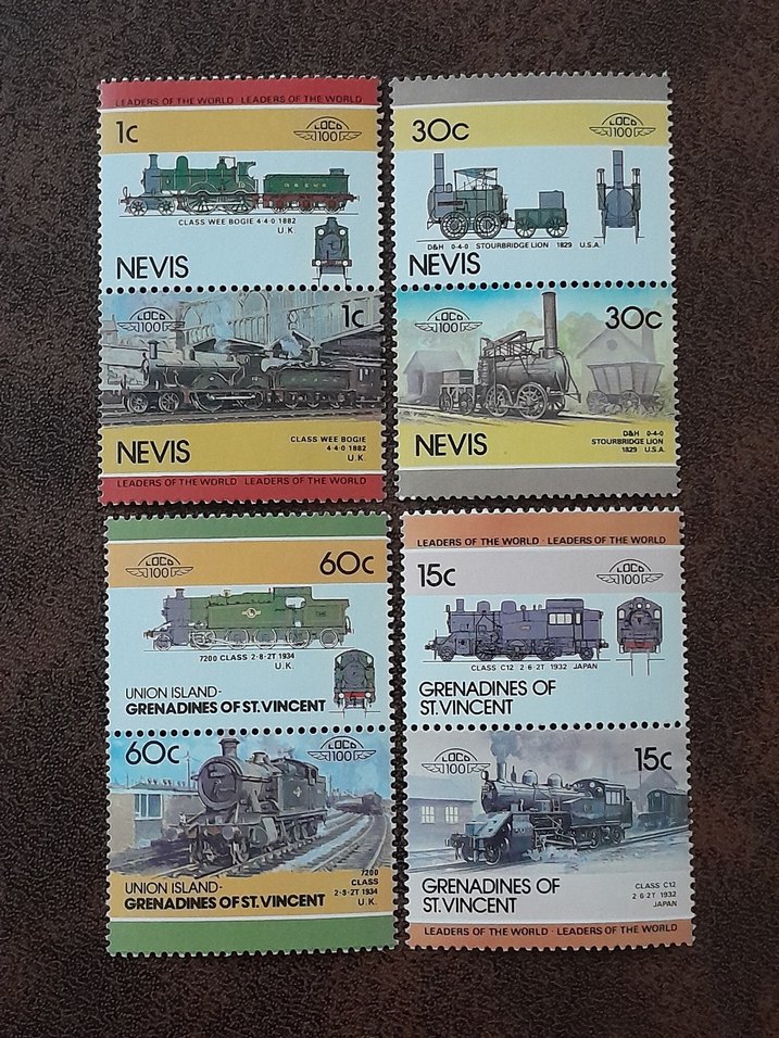 Nevis ve St. Vincent adalarından eski trenleri gösteren pul seti. Farklı lokomotiflerin detaylı çizimleri ve 1c, 15c, 30c, 60c değerleri bulunuyor.