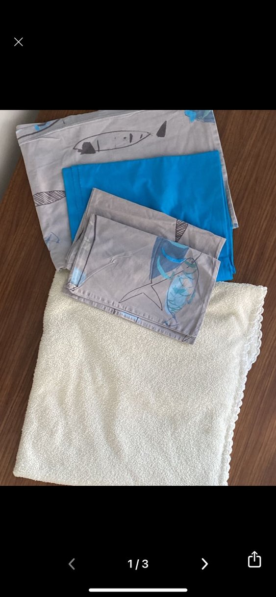 Mavi çarşaf, balık desenli gri yastık kılıfı ve krem peluş battaniyeden oluşan çocuk uyku seti. Yumuşak ve sıcak tutan malzemeler içerir.