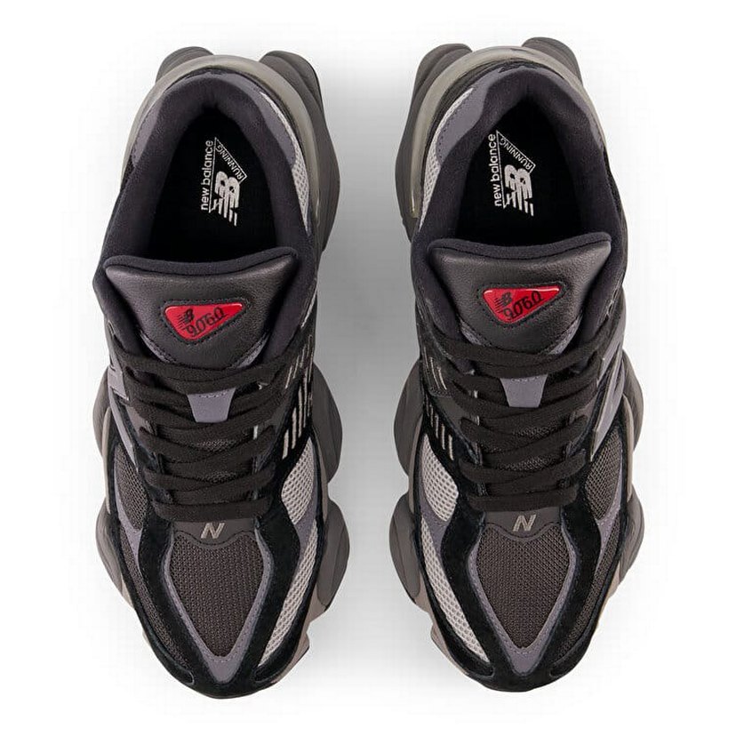 New Balance 1060 platform topuklu siyah spor ayakkabı, desenli ve bağcıklı yapısıyla sokak modasına uygun.