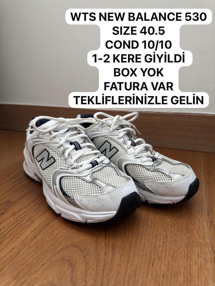 New Balance 530 beyaz ve gri renkli kadın spor ayakkabısı. Baskılı detaylar, düz taban ve bağcıklı. 40.5 numara, 1-2 kez kullanılmış, çok iyi durumda. Kutusu yok, faturası mevcut.