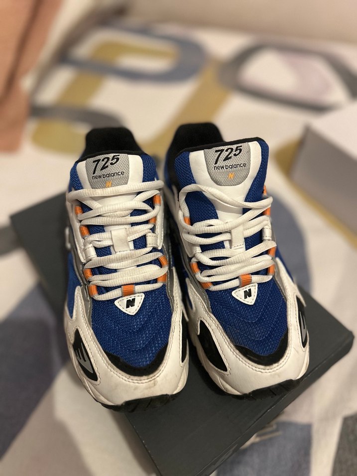 New Balance 725 model lacivert baskılı, beyaz bağcıklı ve kauçuk tabanlı spor ayakkabılar, sokak stili ve athleisure konforunu bir araya getirir. 3 kere kullanıldı herhangi bir deformesi bulunmamaktadır .