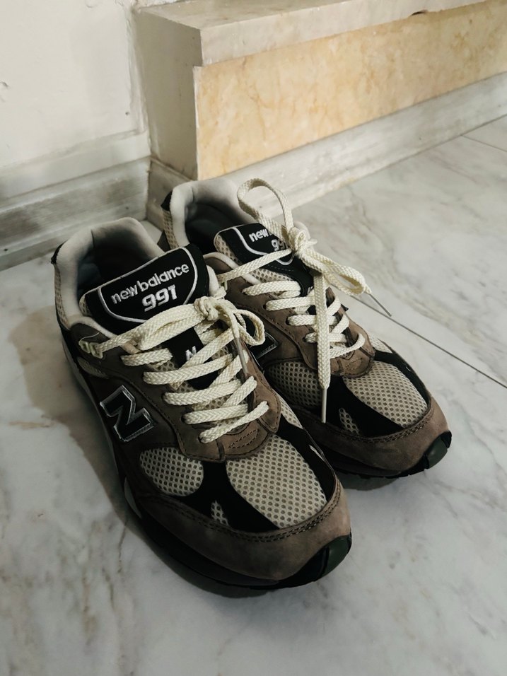 New Balance 991 spor ayakkabı, gri ve kahverengi renklerde, düz tabanlı ve desensiz tasarıma sahip. Kauçuk malzeme konfor sunar, şık ve rahat bir görünüm sağlar. 41.5 numara Orjinal