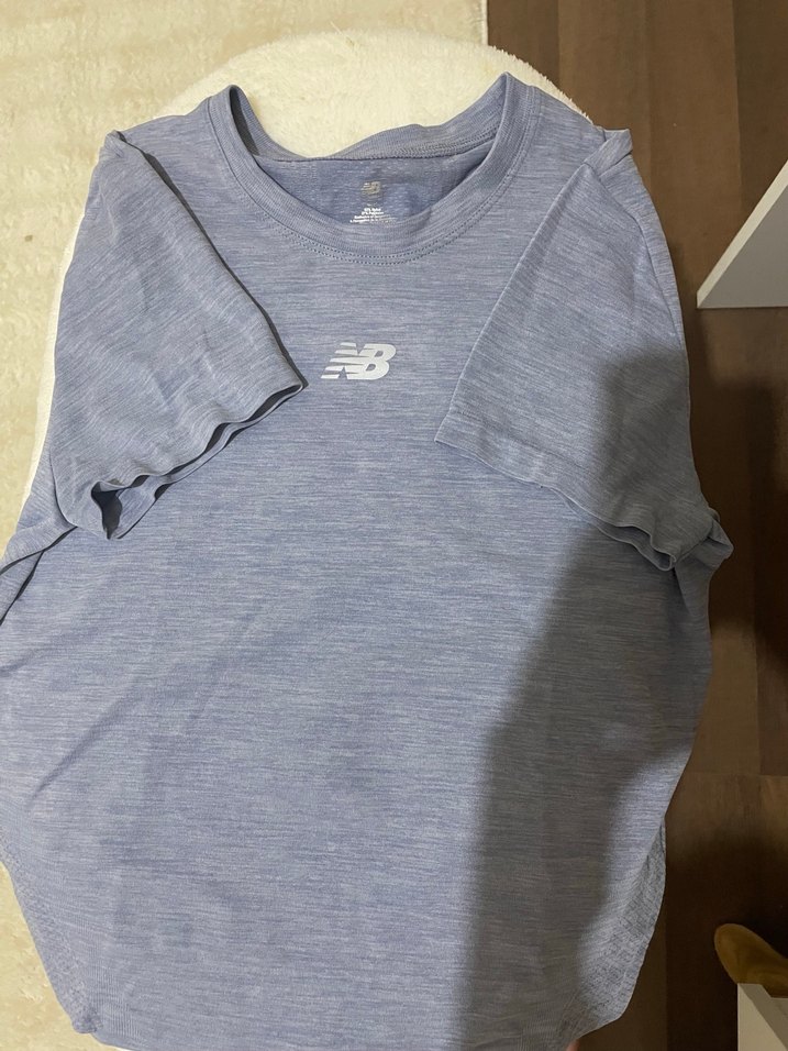 New Balance markalı, pamuk kumaştan yapılmış, kısa kollu ve bisiklet yaka kadın tişörtü. Gri-mavi tonlarında, sade desensiz, günlük kullanıma uygun rahat bir model.