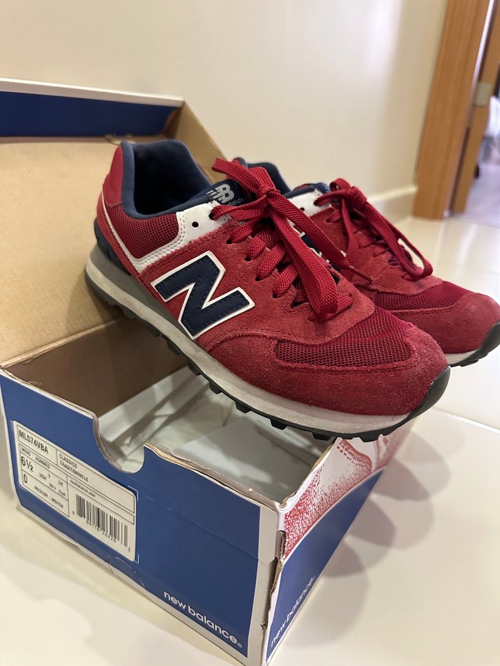 New Balance kırmızı kadın spor ayakkabısı, baskılı detaylar ve düz kauçuk tabanlıdır. Bağcıklı ve spor ile günlük kullanıma uygundur. Normalde 38,5 giyiyorum ama kalıbı küçük olduğu için 39,5 numara aldım ve tam oluyor. Bilgilerinize
