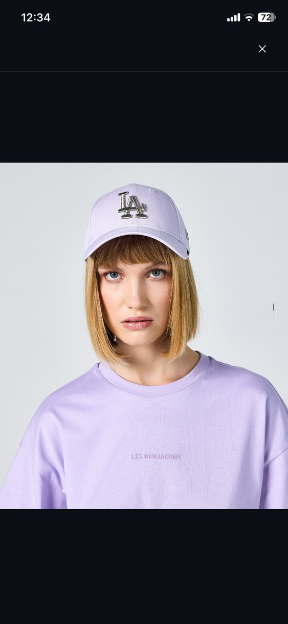 Pastel mor renkte, LA işlemeli, yumuşak sentetik kumaştan yapılmış şapka. Rahat ve şık athleisure tarzı için uygun.