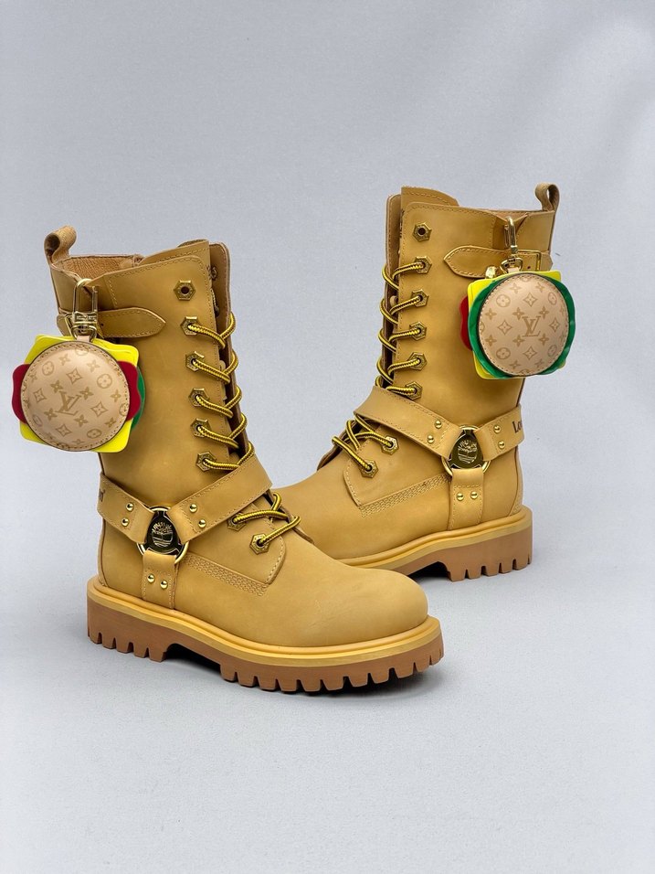 Sarı deri, yüksek topuklu, tokalı ve kamuflaj detaylı kadın botu. Renkli ve avangart sokak stili için uygundur. ITTON markası bulunur. Louis Vuitton LV & Timberland Women Bot & Boot İmported & ithal ürün 36 37 38 39 40 41 size