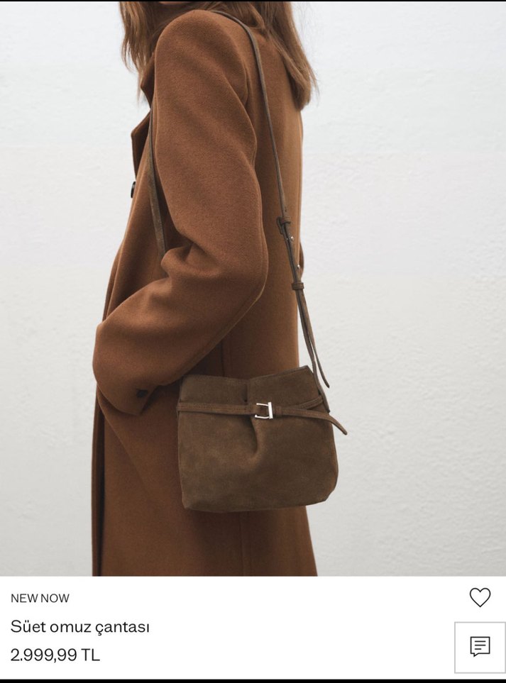 Minimalist tarzda, kahverengi süet omuz çantası, kemer detaylı, günlük ve sokak stiline uygun.