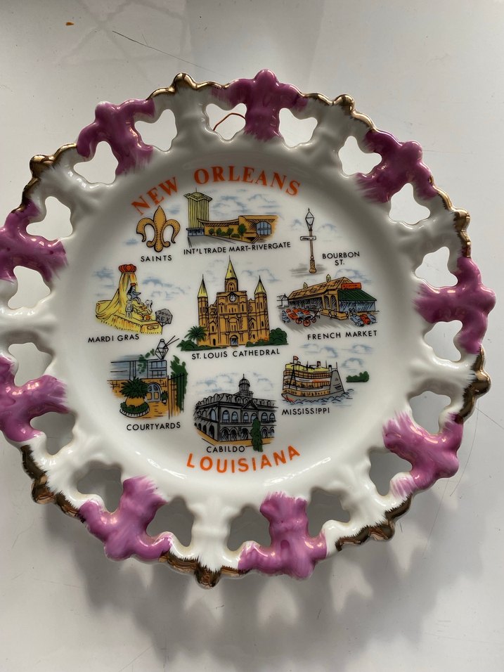 New Orleans simgeleri ve yerleri renkli çizimlerle süslenmiş, pembe ve altın detaylı kenara sahip dekoratif tabak .Duvara asılabilir veya altına ayak koyulup masa üstüne koyulabilir en az 40 yıllık bir tabak