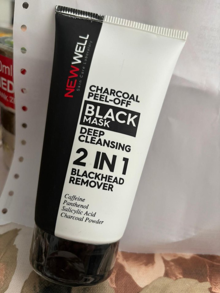 New Well kömürlü soyulabilir maske, kafein, panthenol, salisilik asit ve kömür tozu ile derinlemesine temizlik ve siyah nokta giderimi sağlar.