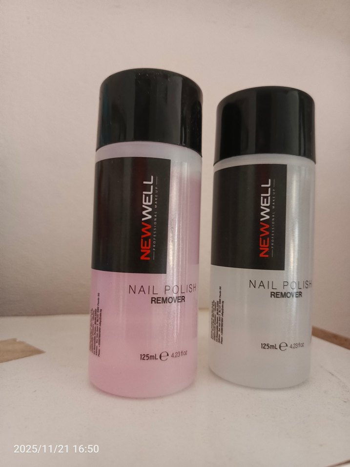 New Well oje temizleyici, 125 ml şişelerde, şeffaf ve pembe sıvı seçenekleriyle sunulur. Oje temizlemede etkilidir.