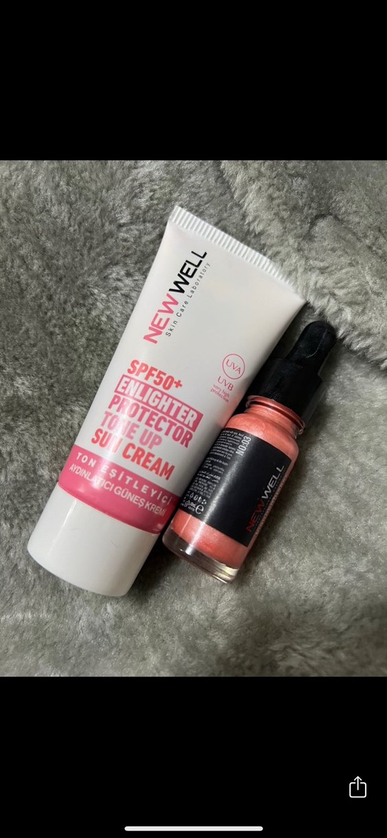 New Well SPF50+ güneş kremi, cildi güneş ışınlarından korur ve aydınlatıcı etki sağlar. UVA ve UVB filtreleri içerir. Yanında küçük ışıltılı pembe allık. Clean girl makyajı