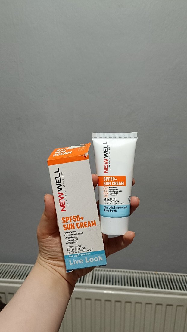 New Well SPF50+ güneş kremi aloe vera ve E vitamini içerir. Hafif dokusu ile çok yüksek koruma sağlar ve canlı bir görünüm sunar. sıfır yenidir sadece kutusu çok küçük yırtıldı