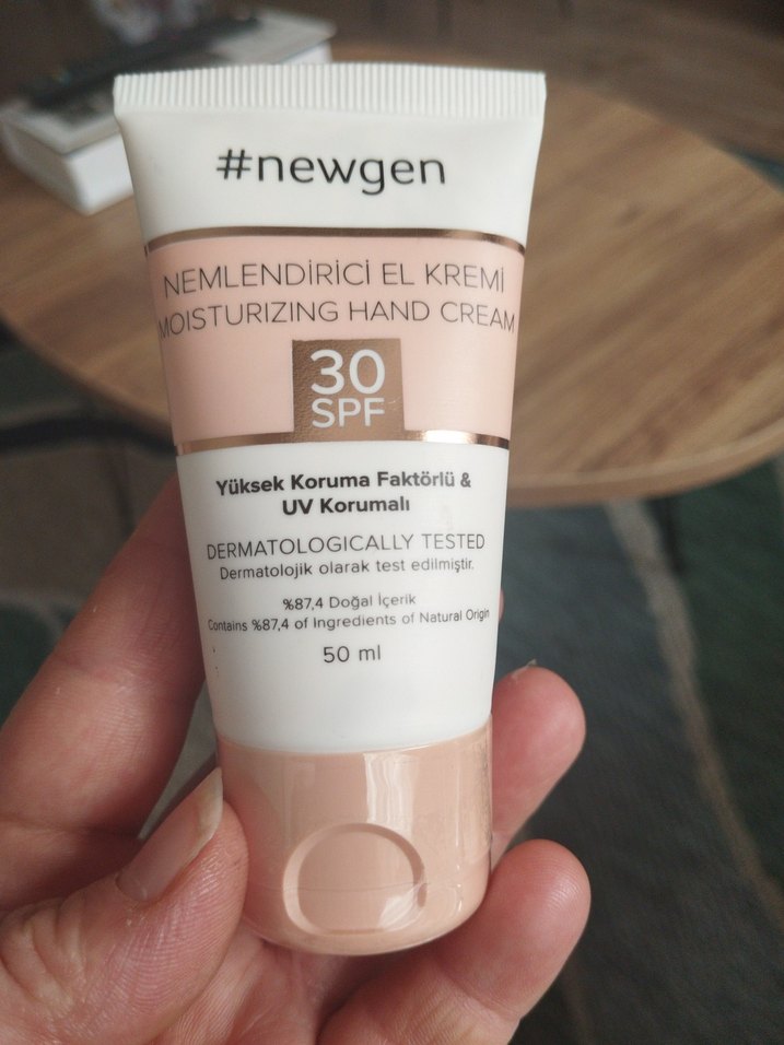 #newgen SPF 30 korumalı nemlendirici el kremi, yüksek koruma ve UV koruması sağlar. Dermatolojik olarak test edilmiştir, %87.4 doğal içeriklidir. 50 ml.