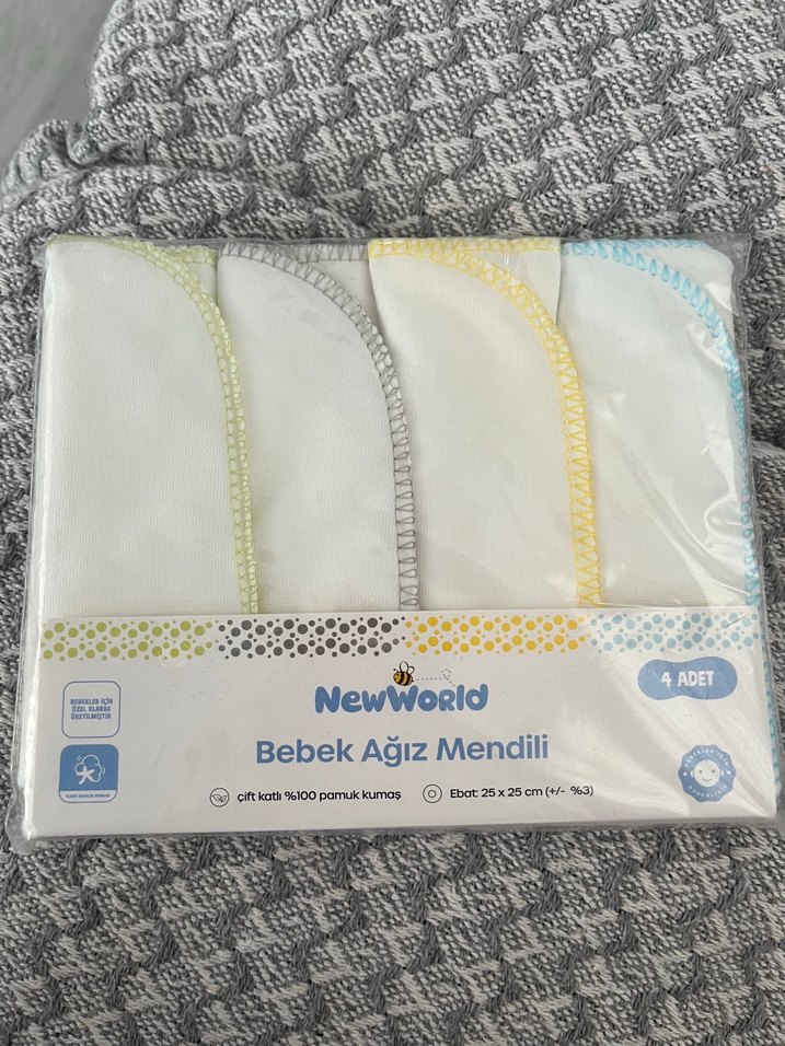 NewWorld markalı, 25x25 cm boyutlarında, işlemeli, yumuşak sentetik kumaştan yapılmış 4'lü bebek ağız mendili seti.