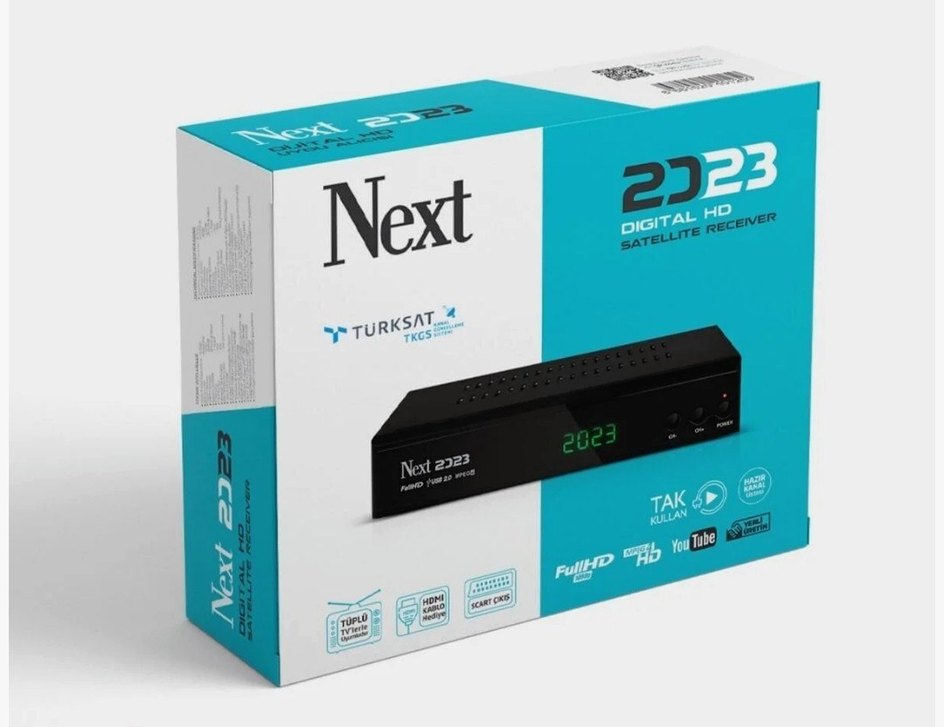 Next 2023 uydu alıcısı, Full HD görüntü, HDMI ve SCART çıkışı sunar. Türksat ve TKGS uyumludur, YouTube erişimi içerir.
