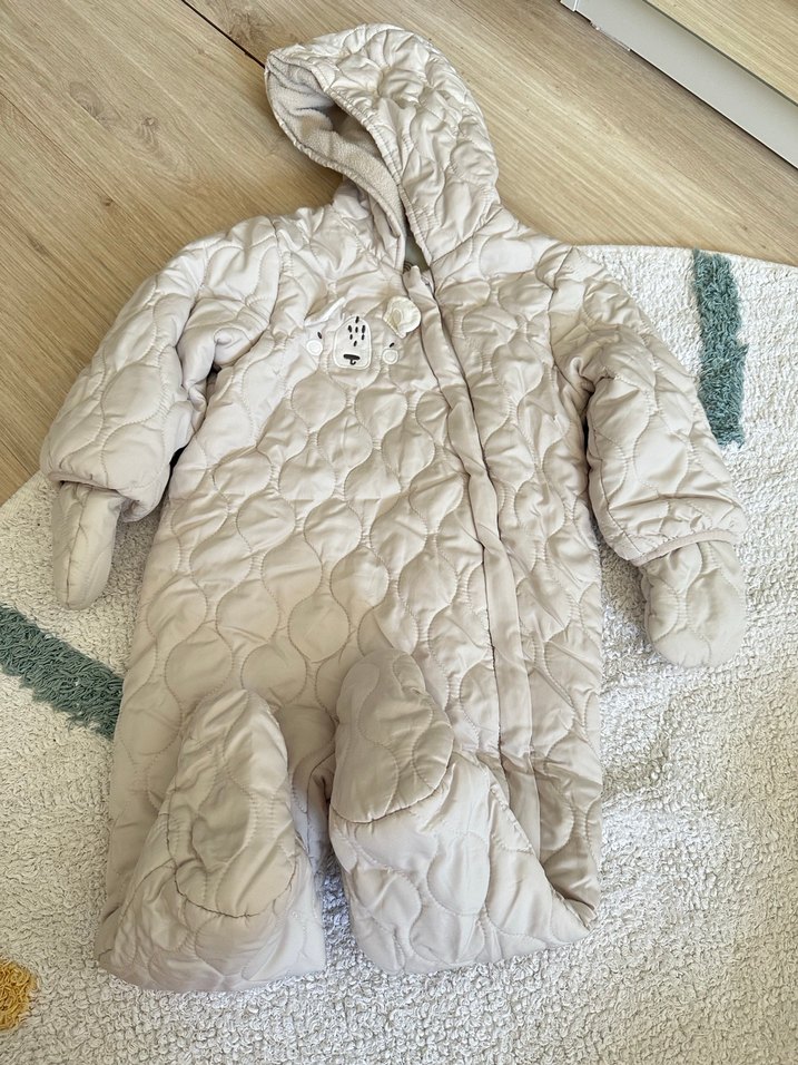 Beyaz, kürklü detaylı, yaka tipi kesimli kız bebek tulumu, yumuşak ve kapitone yapıda, sıcak tutar. ❄️