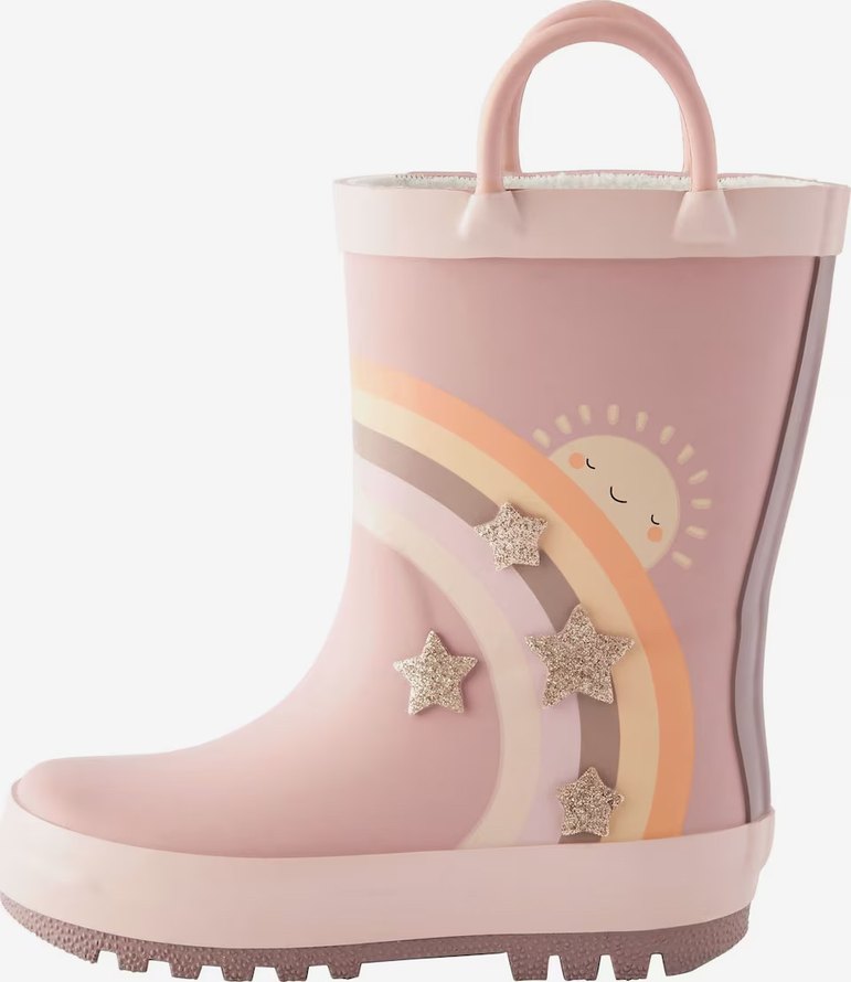 Kızlar için pembe lastik çizme, pastel tie-dye gökkuşağı ve güneş desenli, ışıltılı tokalı yıldız süslemeleriyle. Bohem tarz, kolay tutma kulplu.