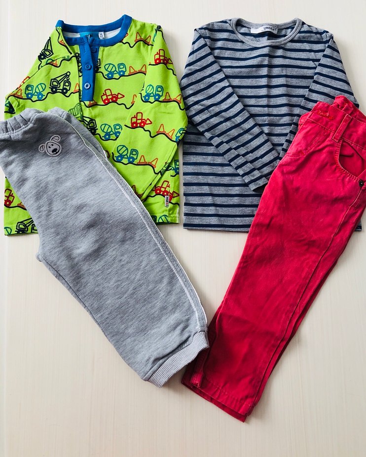 Renkli erkek bebek 4 parça takım; iki uzun kollu bisiklet yaka üst ve iki alt eşofman ve pantolondan oluşur. Pamuklu dokusu ve rahat tekstil kumaş kullanılmıştır. 2-3 yaş