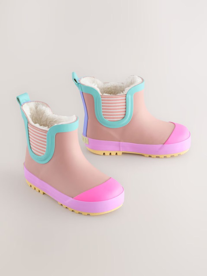 Peluş astarlı, pastel pembe kauçuk kız çocuk yağmur çizmesi, pop kültür tarzında ve rahat kullanıma uygun.