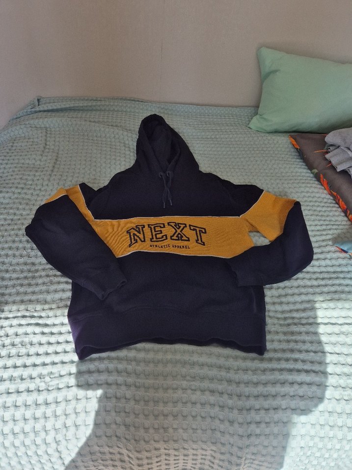 Next marka kapüşonlu sweatshirt, uzun kollu ve yumuşak tüylü kumaş üzerine baskılı "NEXT" yazılı tasarıma sahiptir. Günlük kullanım için uygundur. İçi polar. Small beden.
