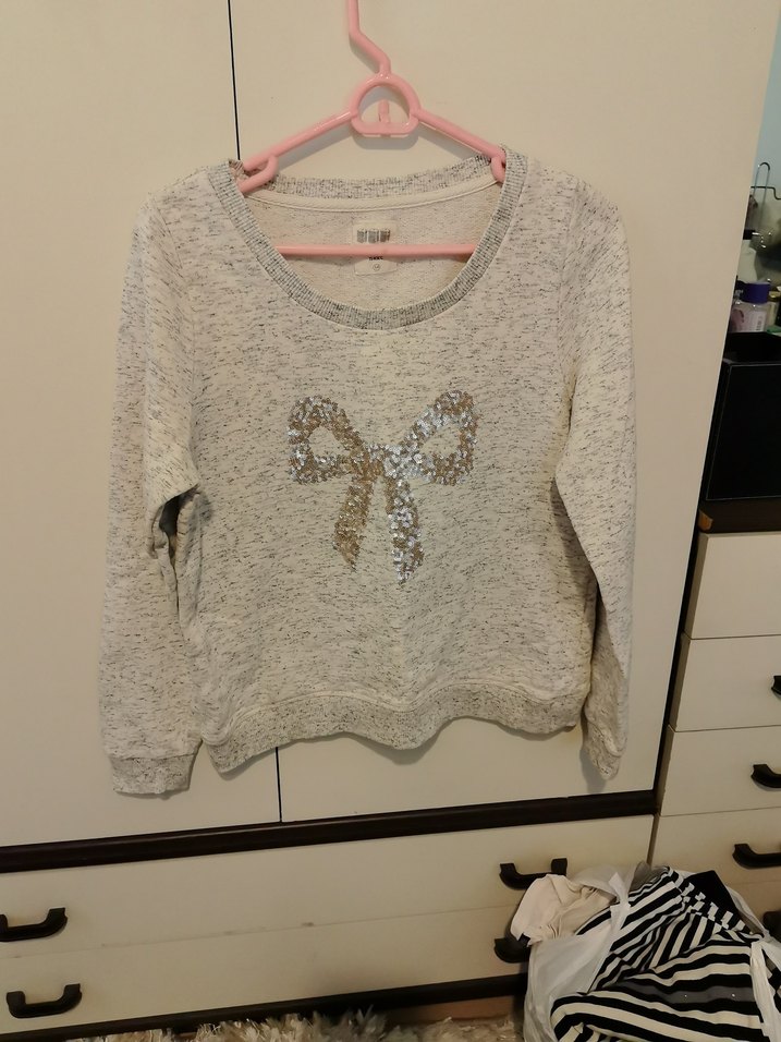 Gri renkte, uzun kollu ve yuvarlak yakalı triko sweatshirt. Önünde payetli fiyonk baskısı bulunur, rahat ve trend sokak stili sunar. Hiçbir sorunu yok. Küçük olduğu için satıyorum.