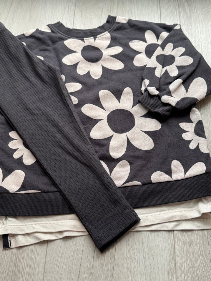 Gri tonlarda büyük çiçek desenli, uzun kollu, bol kesim kız triko kazak. Rahat ve günlük kullanıma uygun. Bir iki kere giyildi