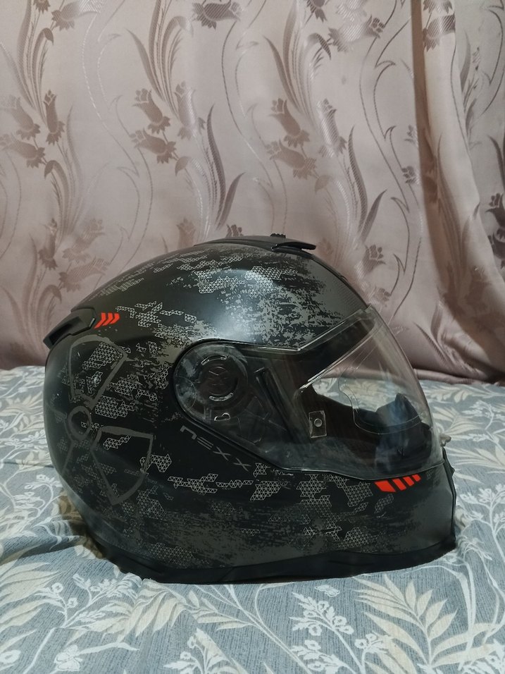 Desenli siyah motosiklet kaskı, kauçuk malzemeden ve kilitli yapıda. Rock punk tarzına uygun. ️