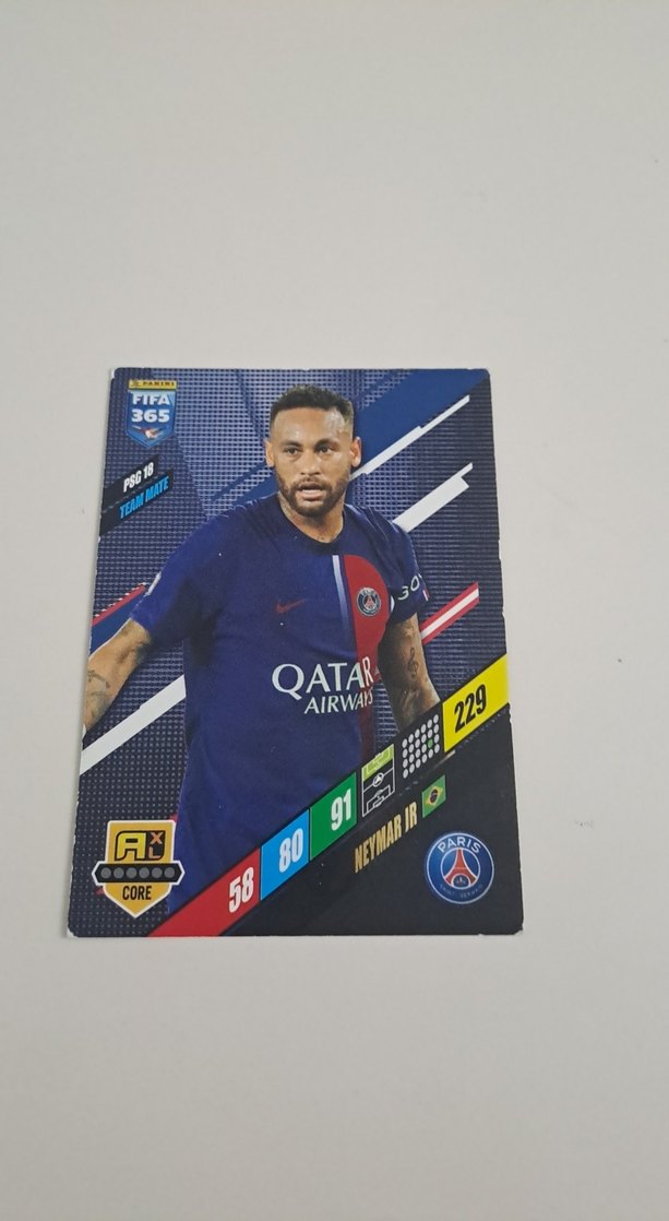 Koyu mavi Neymar Jr. futbol kartı, oyuncu istatistikleri ve PSG logosu ile. 'QATAR AIRWAME' yazısı ve 58, 80, 91 sayıları bulunur. ⚽