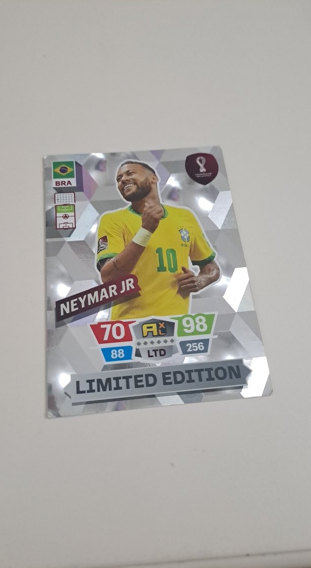 Neymar Jr'yi gösteren sınırlı sayıda altın rozet. Canlı renkler ve pop kültür tarzı ile birlikte istatistikler ve resmi işaretler bulunur. ⚽