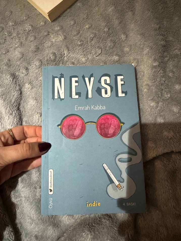 Emrah Kabba'nın NEYSE adlı romanı, yuvarlak pembe gözlükler ve sigara resmiyle dikkat çeken kapağa sahip.