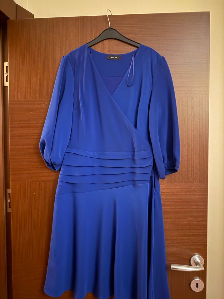 Mavi midi elbise, V yaka ve drapeli tasarıma sahip. Bol kesim, askılı kollu ve parlak, desensiz kumaşıyla modern klasik ofis şıklığı sunar. ✨sadece 1 kez giyildi