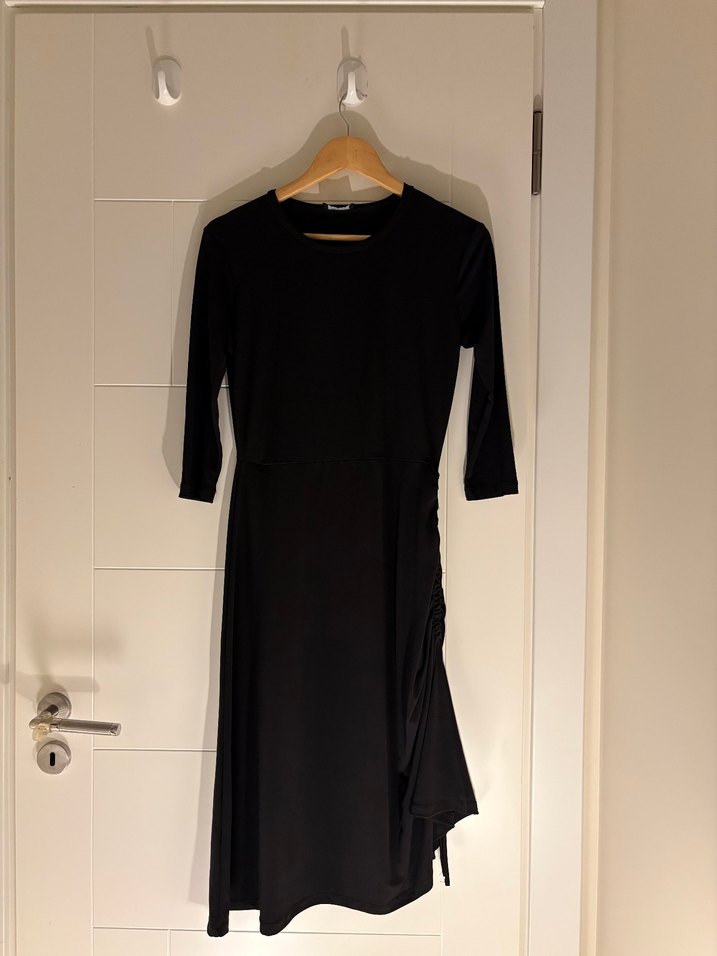 NG001 Ürün içeriği: 95% polyester 5% elastan Yarım kollu, bisiklet yaka ve drape detaylı, vücuda oturan siyah elbise. Sol taraftaki ip sayesinde asimetrik olarak kullanılabilir. Sadece 1 kere giyildi ve yıkandı.