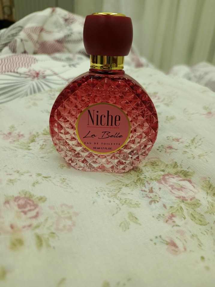 Niche LaBelle kadın parfümü, 50 ml şişede, dokulu kırmızı cam ve altın detaylı kapaklı. Zarif bir koku sunar.