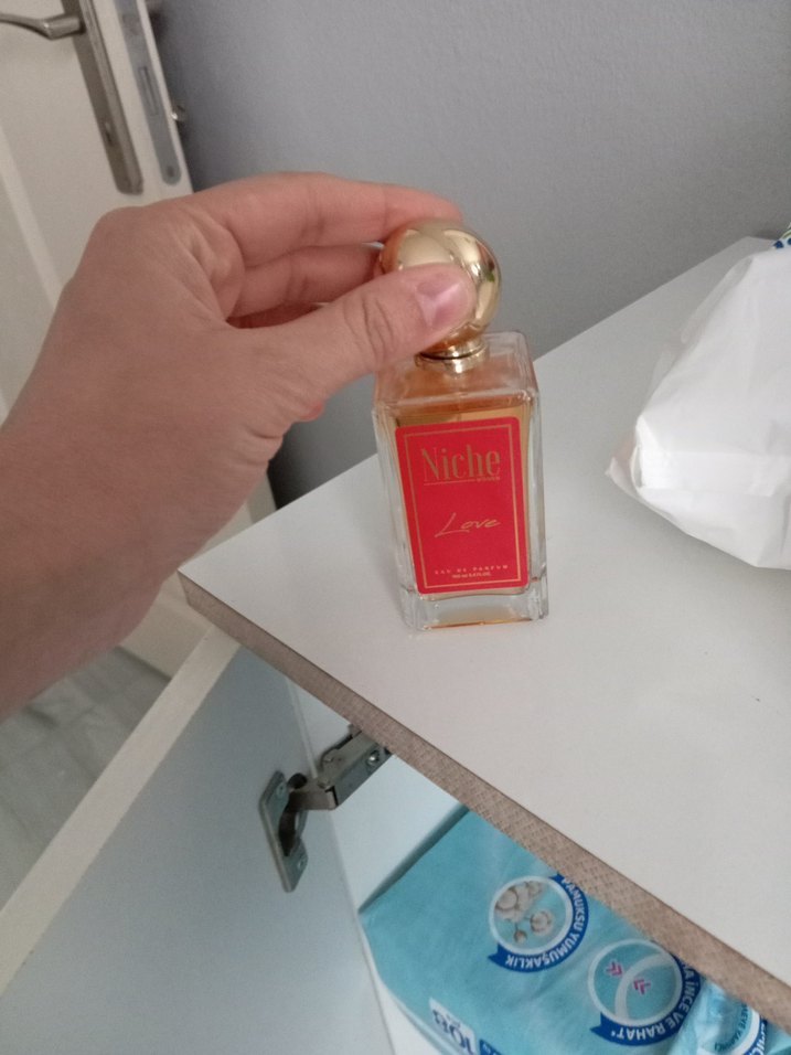 Niche Love kadın parfümü, kırmızı etiketli ve altın kapaklı şeffaf cam şişede, zarif ve sofistike bir koku sunar.