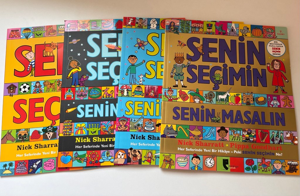 Nick Sharratt'ın renkli kapaklı çocuk kitapları seti. Her kitap "Senin" serisinden ve her seferinde yeni bir hikaye sunuyor.