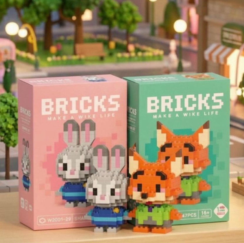 Renkli Lego tuğlalarından oluşan set, tavşan ve tilki figürleri içerir. Çok renkli parçalarla canlı görünüme sahiptir.