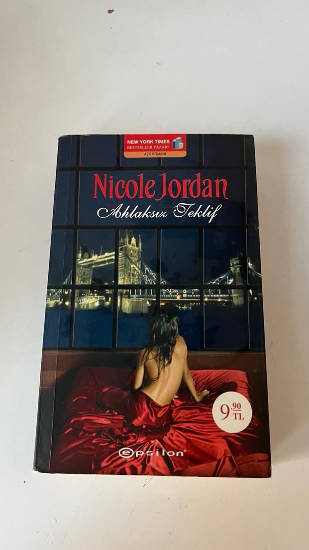 Nicole Jordan'ın "Ahlaksız Teklif" adlı romanı, kırmızı elbiseli bir kadının şehir manzarası önündeki görseliyle dikkat çekiyor.