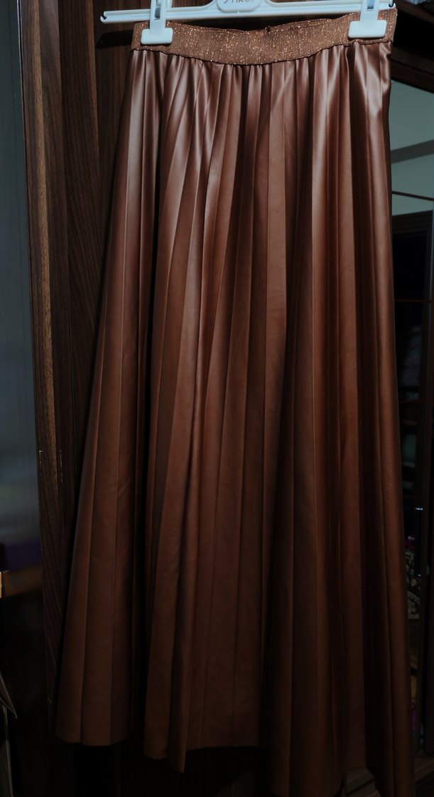 Kadın kahverengi uzun pilili etek, sentetik kumaştan, regular fit ve minimalist ofis tarzına uygun.