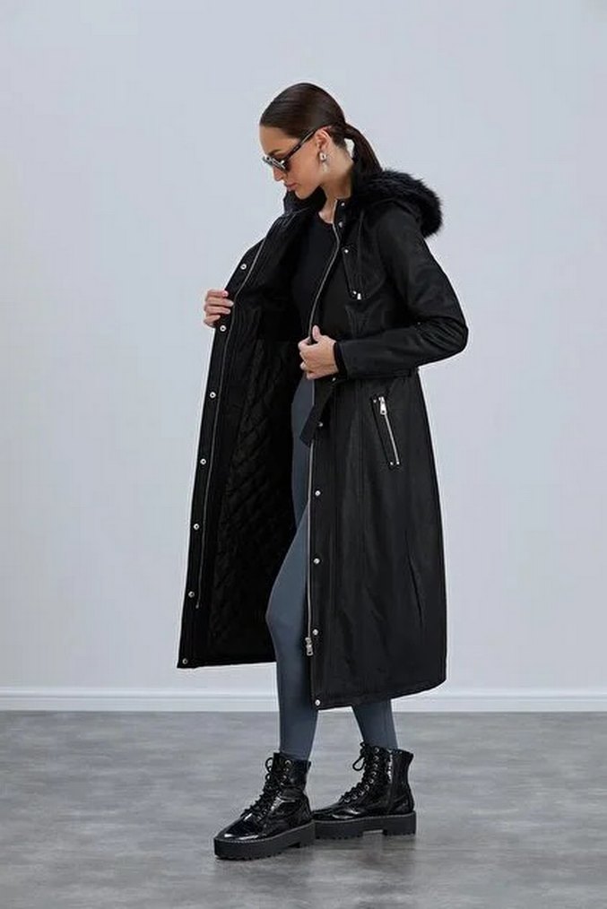 Siyah uzun süet parkada kürklü kapşon ve kesik yaka bulunur. Uzun kollu ve regular fit, günlük sokak stili için uygundur. Hediye geldi iki kere giyildi içindeki kürk kısmı çıkarılabilir fermuarlıdır. #nihan #mont #kaban #yağmurluk #tesettür #nihanmont