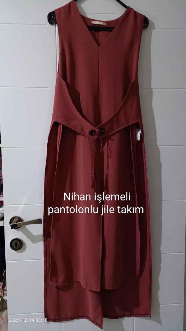Gül kurusu renkte Nihan marka 38 beden jile takım. Bol paça Pantolon ve hileden oluşmaktadır. V yaka arkası nakış işlemeli. Sayılı kullanıldı sıfır ayarında. Pantolon bel 39-40 cm civarı fermuarlı. Jile iki kol arası mesafe de görselde mevcut 42 cm civarı. Jilenin kol altları çıt çıtlı kaplamadır. Rahat kullanım sağlar