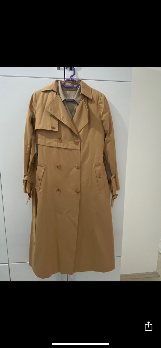 Açık bej renkli kadın trençkot, kesilmiş yaka ve kemerli bel detayına sahiptir. Uzun kollu, regular fit ve çift düğmeli ön tasarıma sahip, ofis için uygundur. Sentetik kumaştan yapılmıştır, klasik şıklık sunar.